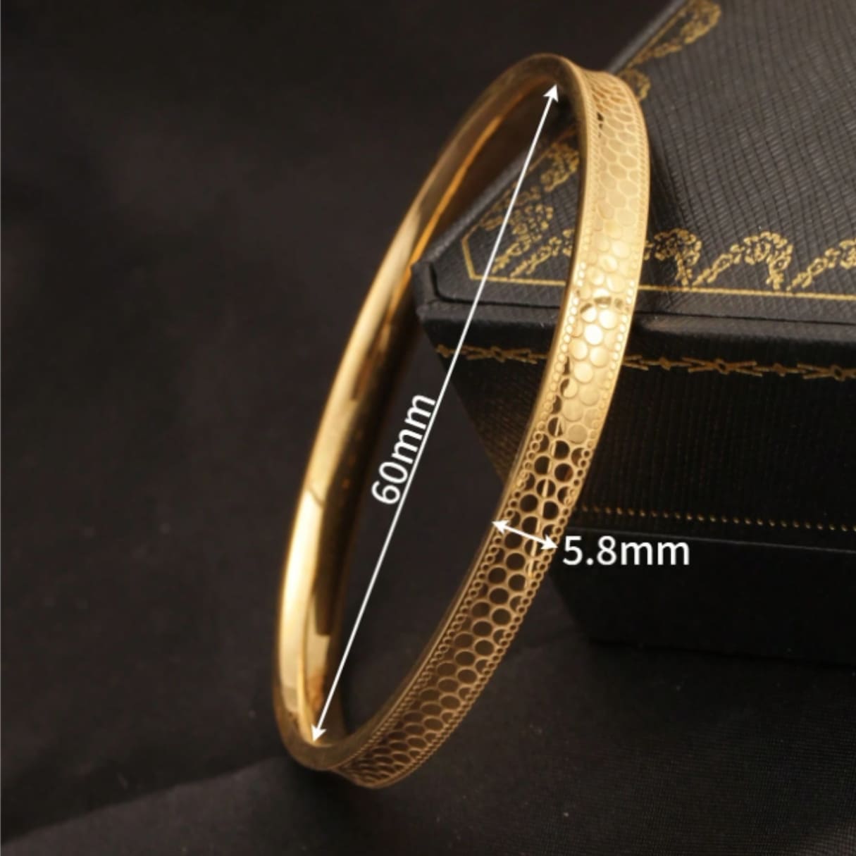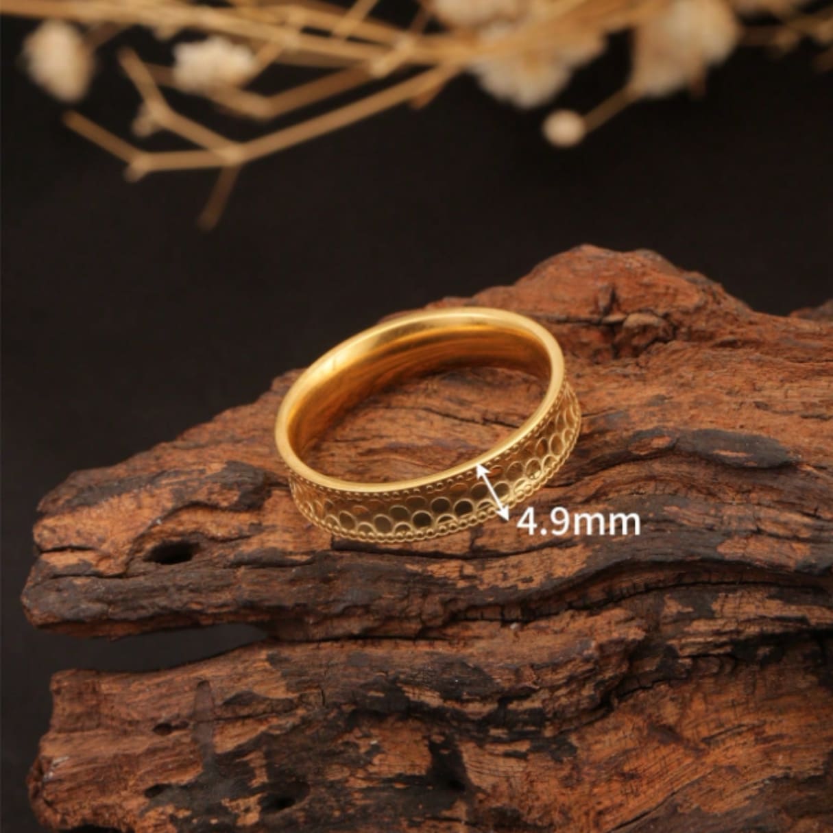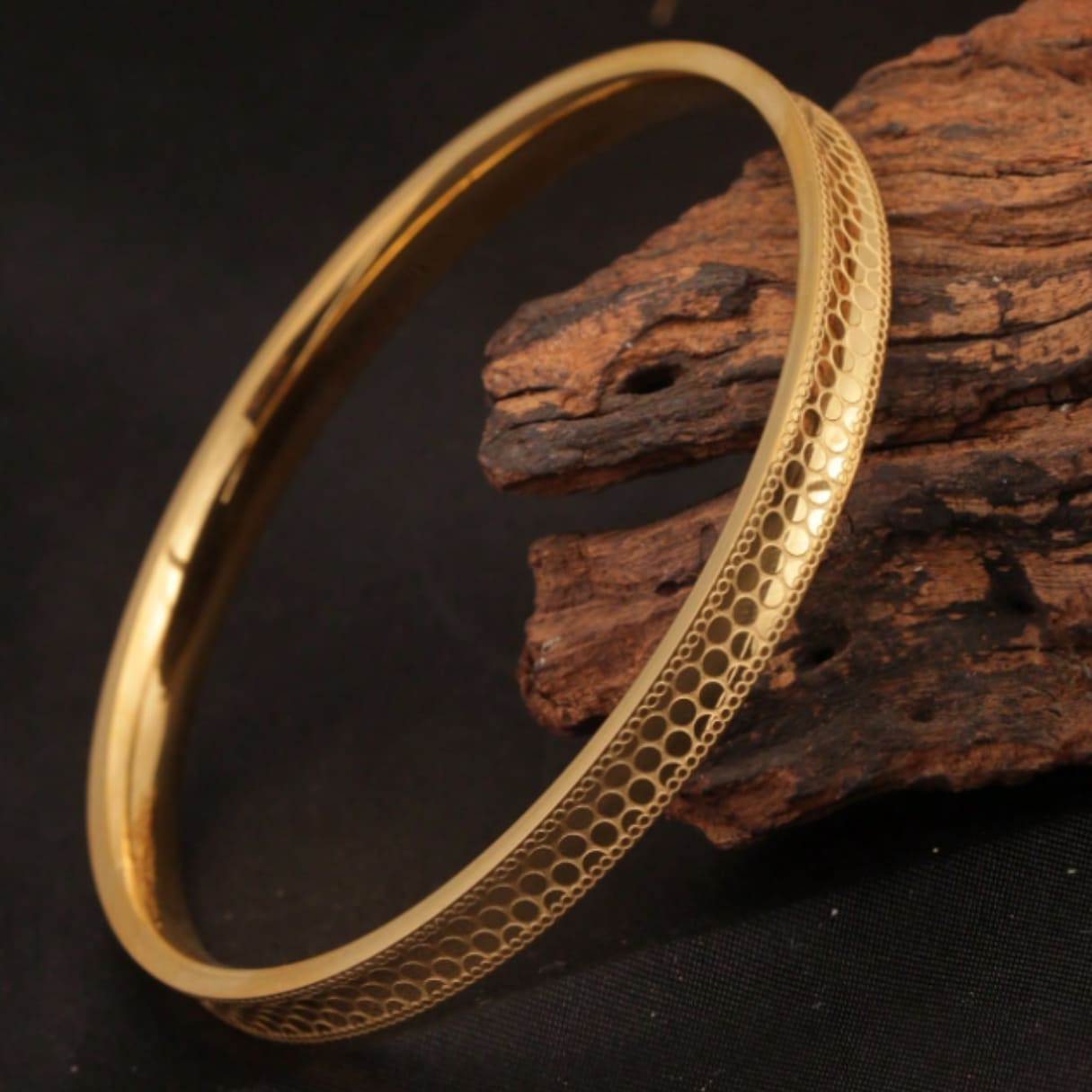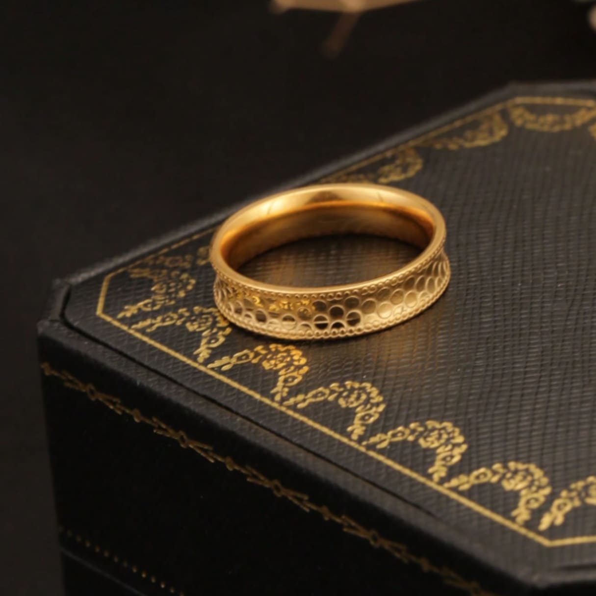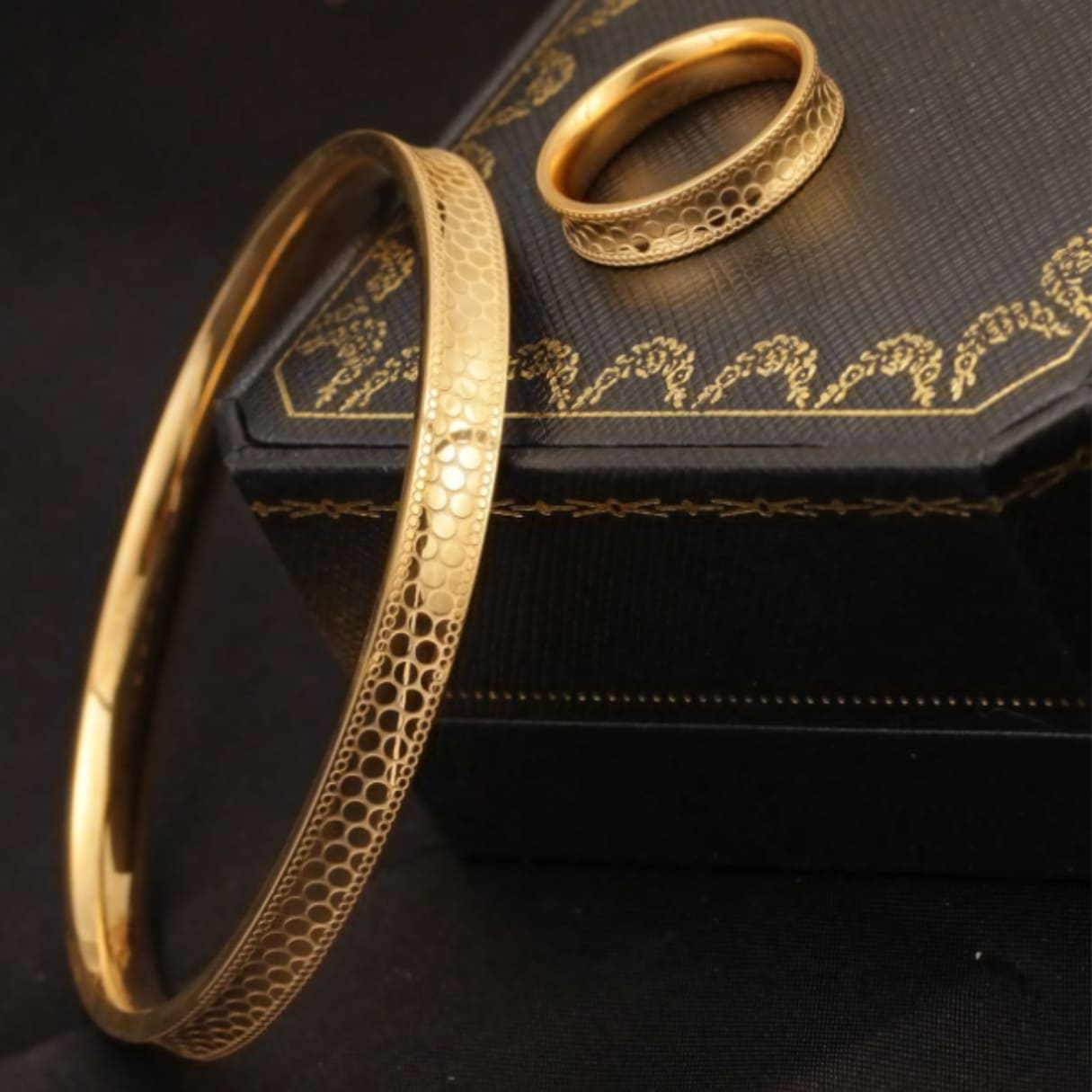 تتكون المجموعة من غويشة ذهبية أنيقة وخاتم متناسق من نفس التصميم الفخم.