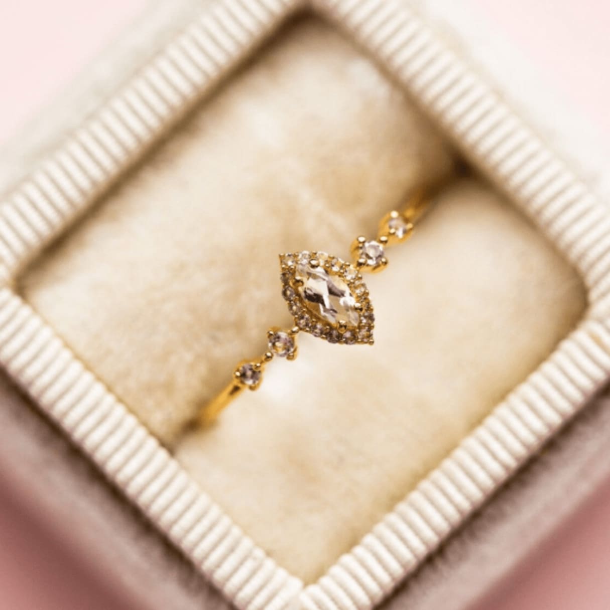 أضيفي لمسة من الفخامة الراقية إلى إطلالتك مع خاتم الكريستالة الذهبي الفخم، الذي يتألق بحجر كريستال مركزي بقصة ماركيز الأنيقة، محاط بهالة من الأحجار البراقة الصغيرة التي تعزز لمعانه. يزدان طوق الخاتم الذهبي النحيف بصفوف متناثرة من الكريستالات المتلألئة، مما يمنحه مظهراً يشع بريقاً يشبه الألماس، وهو مثالي لجميع مناسباتك.