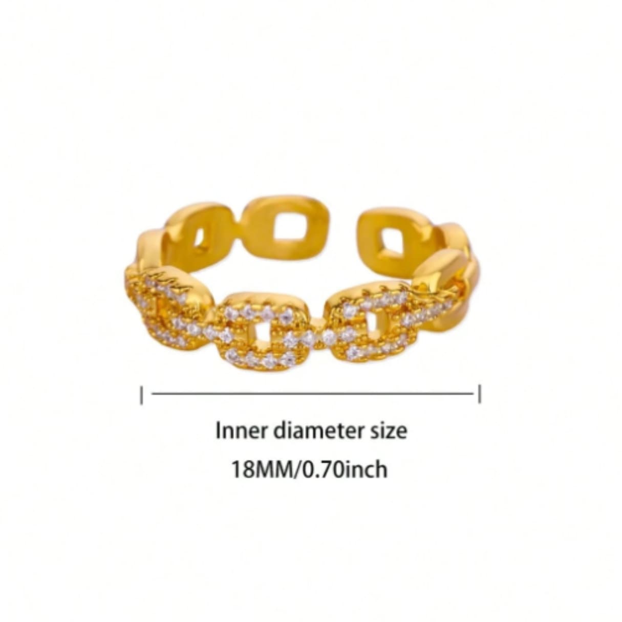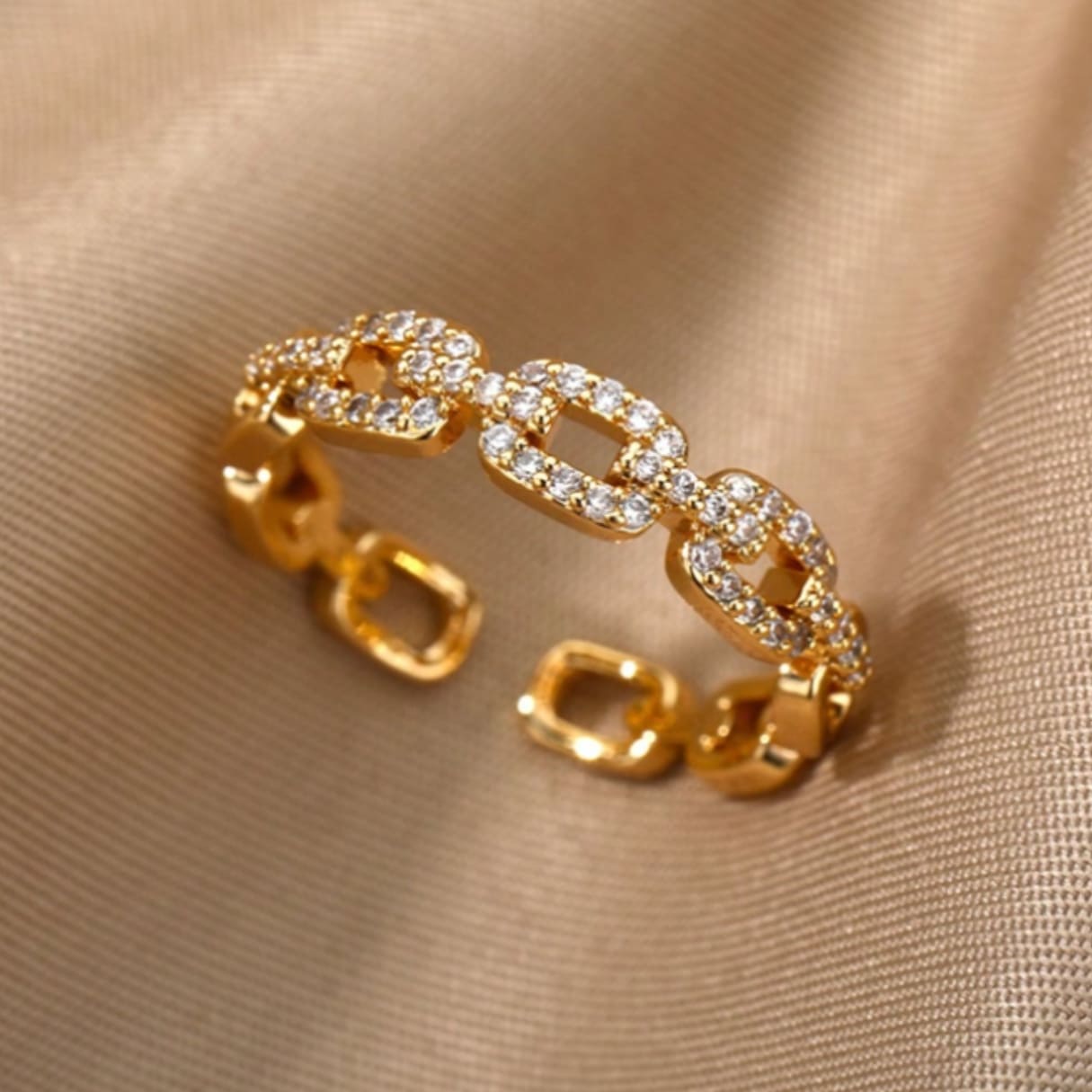 خاتم ذهبي فاخر ذو تصميم هندسي معاصر يتميز بحلقات متصلة مرصعة بفصوص كريستالية متلألئة، مما يضيف بريقاً وجاذبية عصرية لأي إطلالة. يتميز هذا الخاتم بكونه فري سايز (قابل للتعديل) لضمان ملاءمة مريحة ومثالية لمختلف أحجام الأصابع.