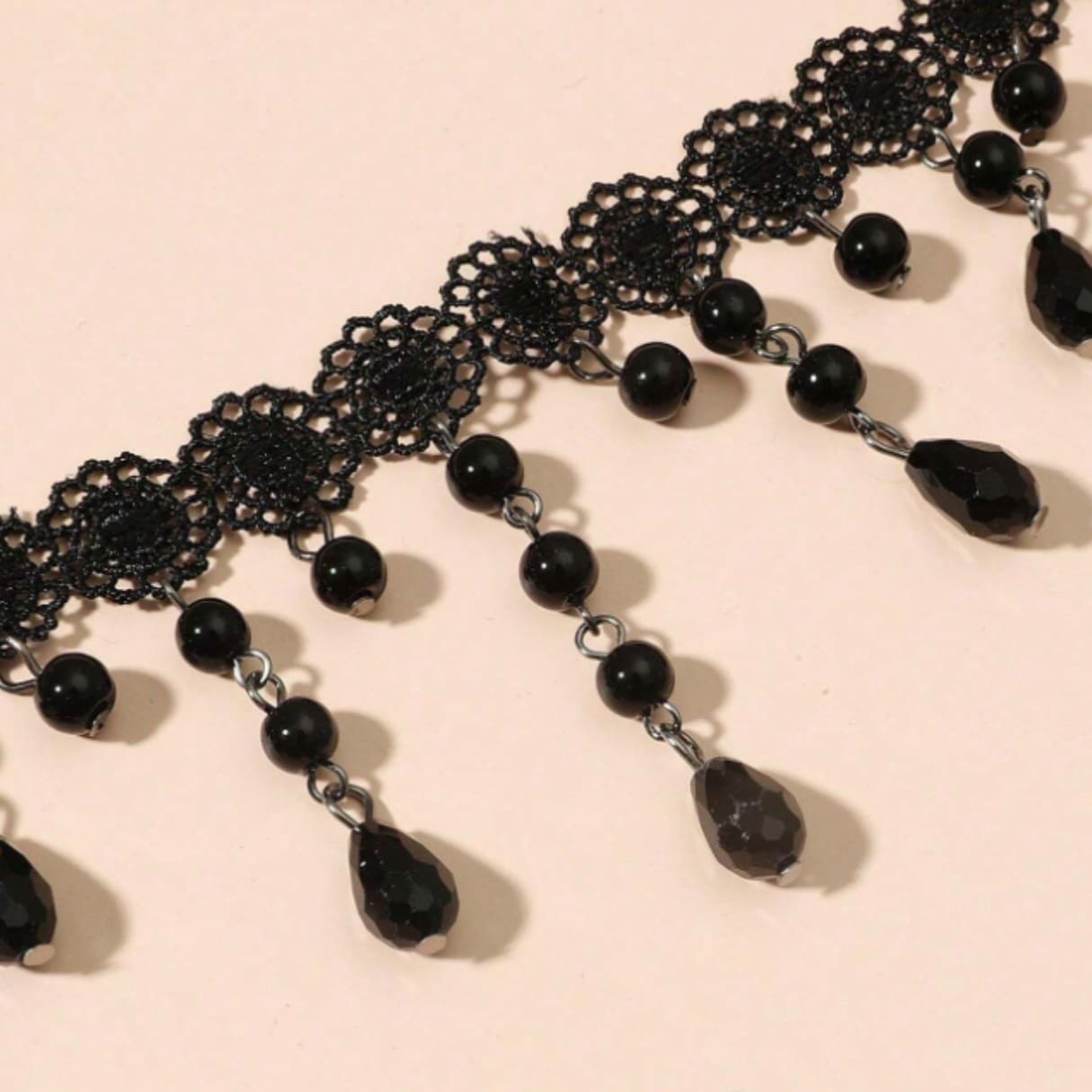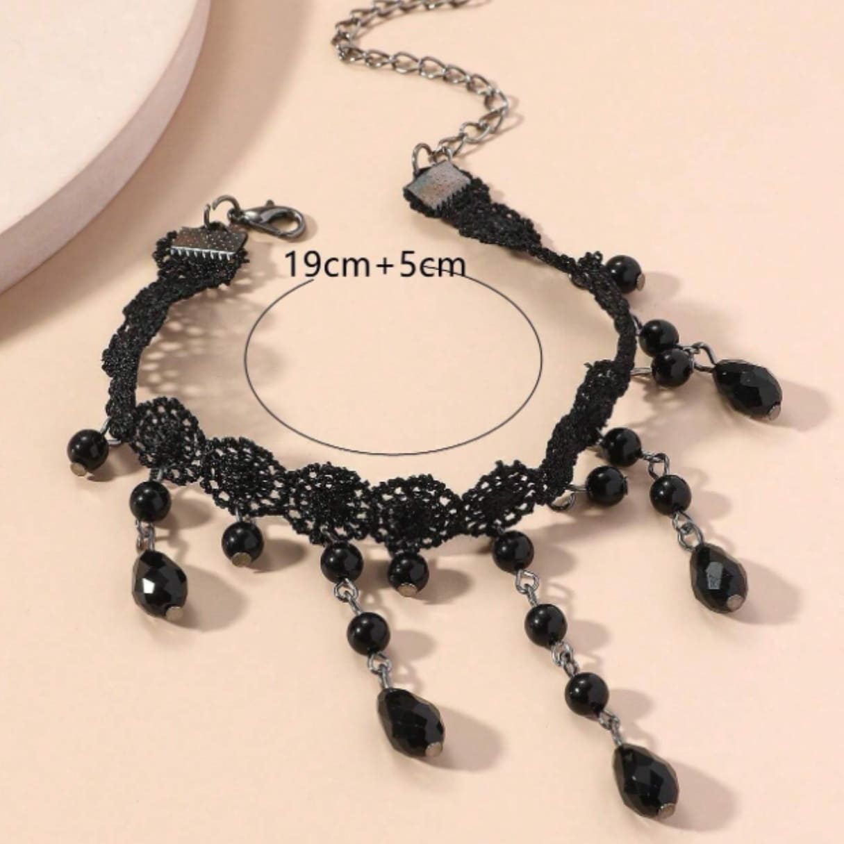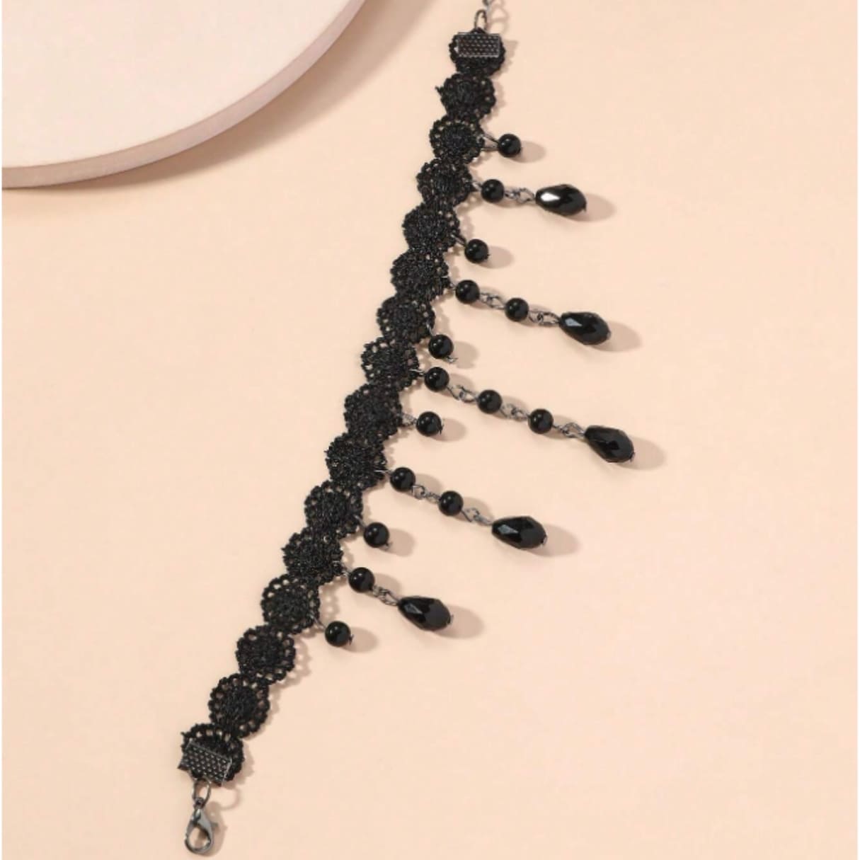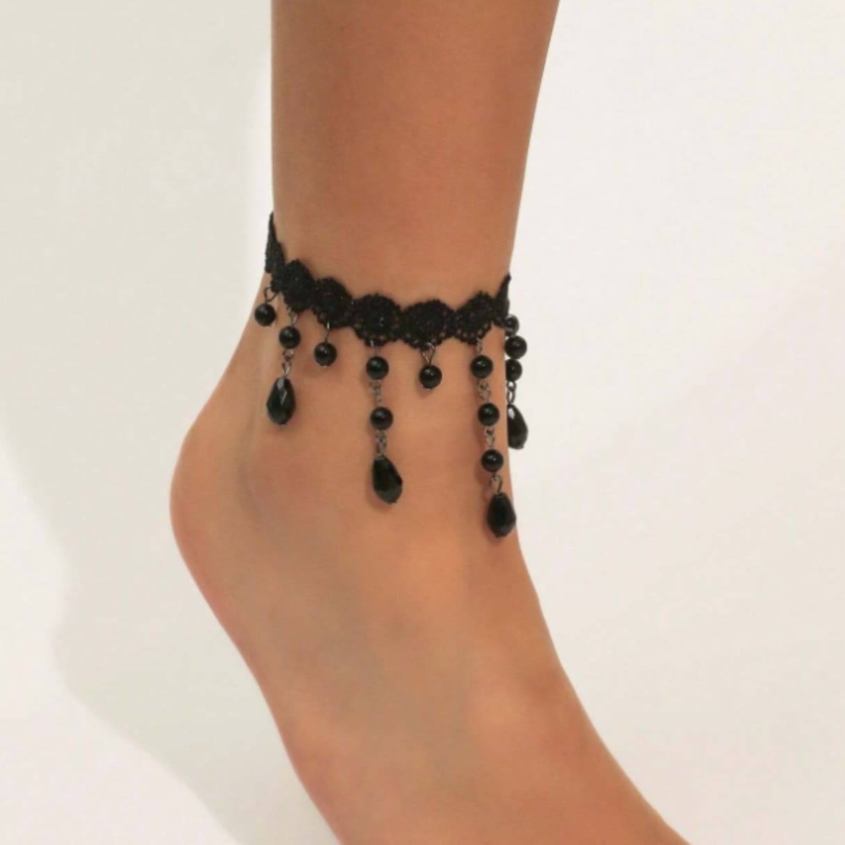 خلخال شريط دانتل مع خرزات متدلية - أسود
