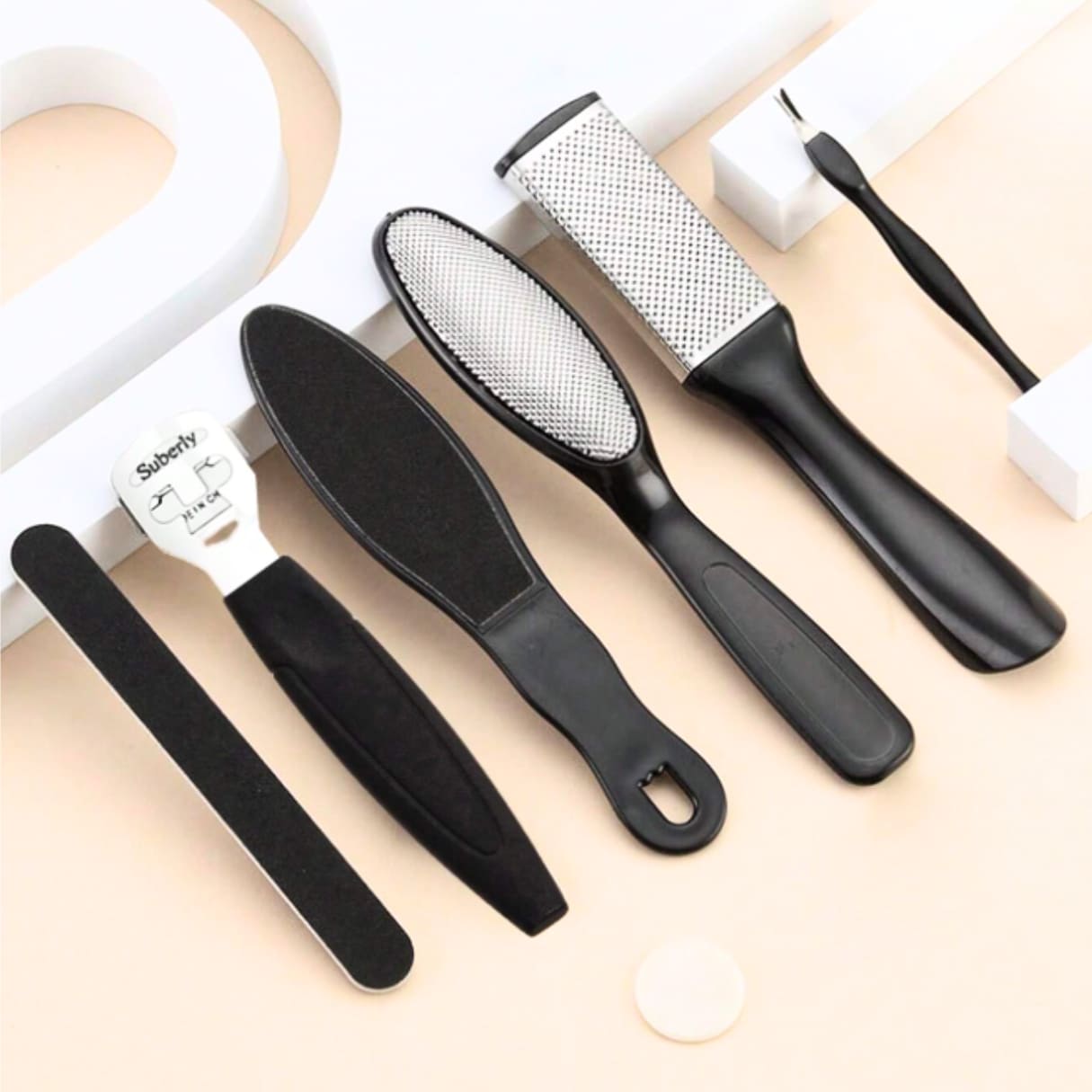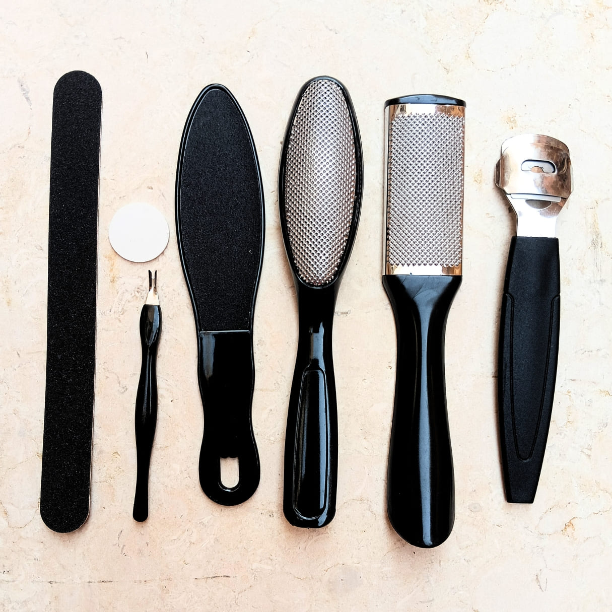 يتكوّن الطقم من قطع متنوعة بعناية لتناسب كل خطوات العناية بالقدم مع مقبض مريح لكل أداة لضمان تحكم آمن وسهل أثناء الاستخدام. كما أن الخامات المستخدمة مقاومة للصدأ وسهلة التنظيف، مما يجعل الطقم آمنًا تمامًا لإعادة الاستخدام لفترات طويلة دون قلق.